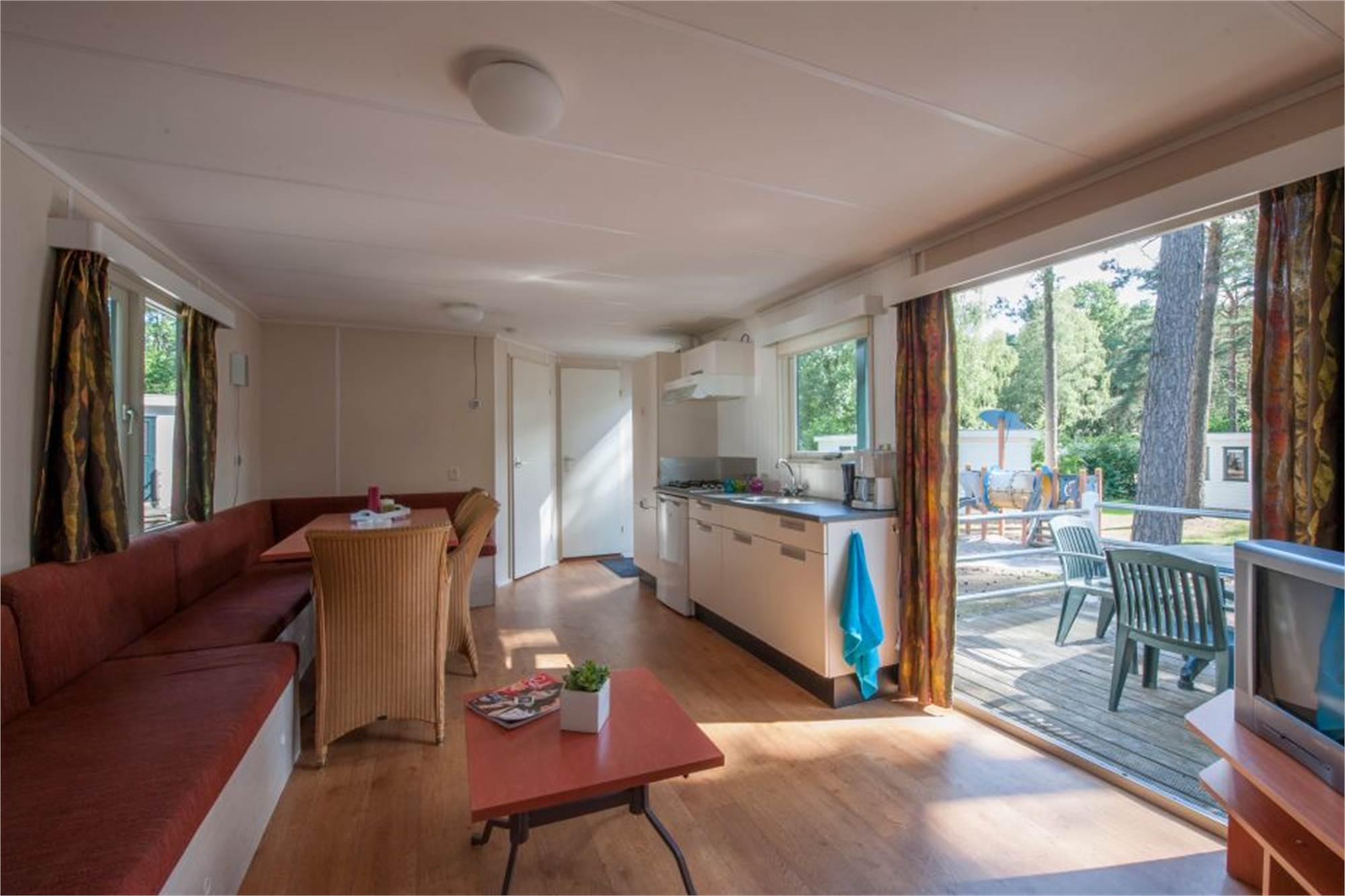 Dieser freistehende Chalet eignet sich für 5 Personen und 1 Baby. Es gibt ein Wohnzimmer mit Essbereich und eine offene Küche. Außerdem finden Sie 3 Schlafzimmer sowie ein Badezimmer mit Dusche, Waschtisch und Toilette. Jedes Chalet ist mit Kinderbettchen, Kinderstuhl und möblierter Terrasse ausgestattet und der Garten ist umzäunt.