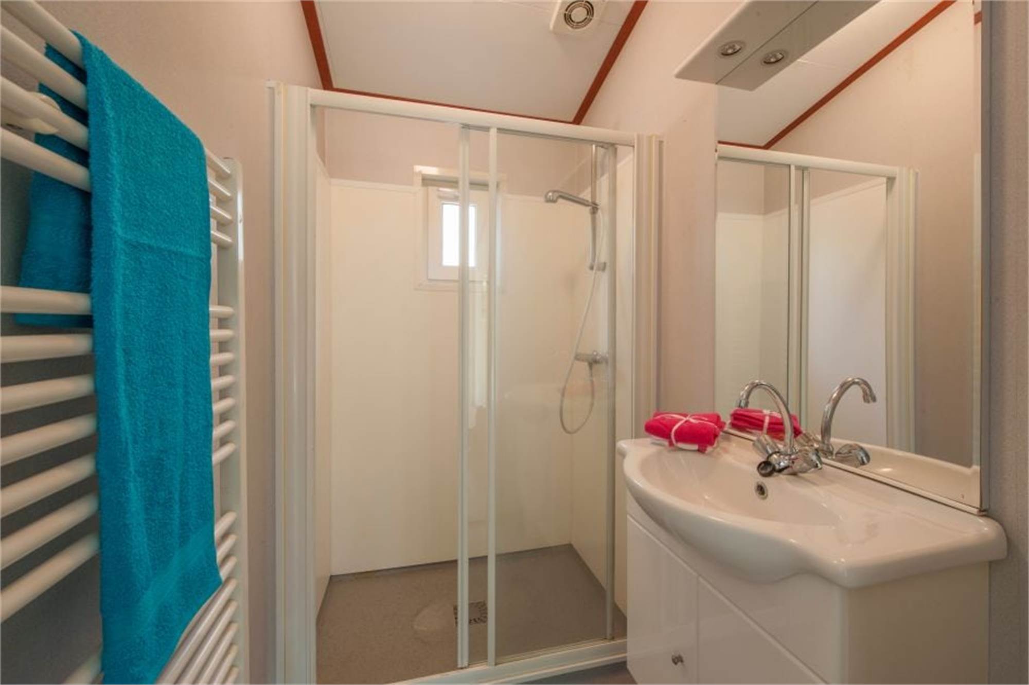 Dieses große Chalet für 6 Personen verfügt über ein Wohnzimmer mit Flügeltüren sowie eine offene Küche mit Essbereich. Es gibt 3 Schlafzimmer, eins davon mit Etagenbett, ein Badezimmer mit Dusche und Waschtisch und eine separate Toilette. Die Unterkunft bietet außerdem eine möblierte Terrasse und einen Abstellraum.