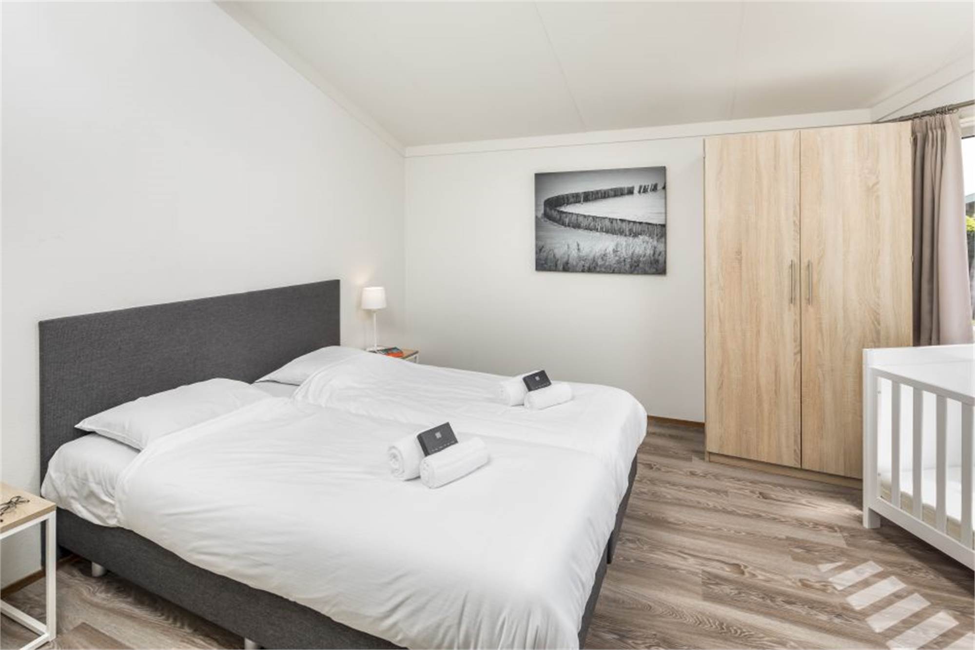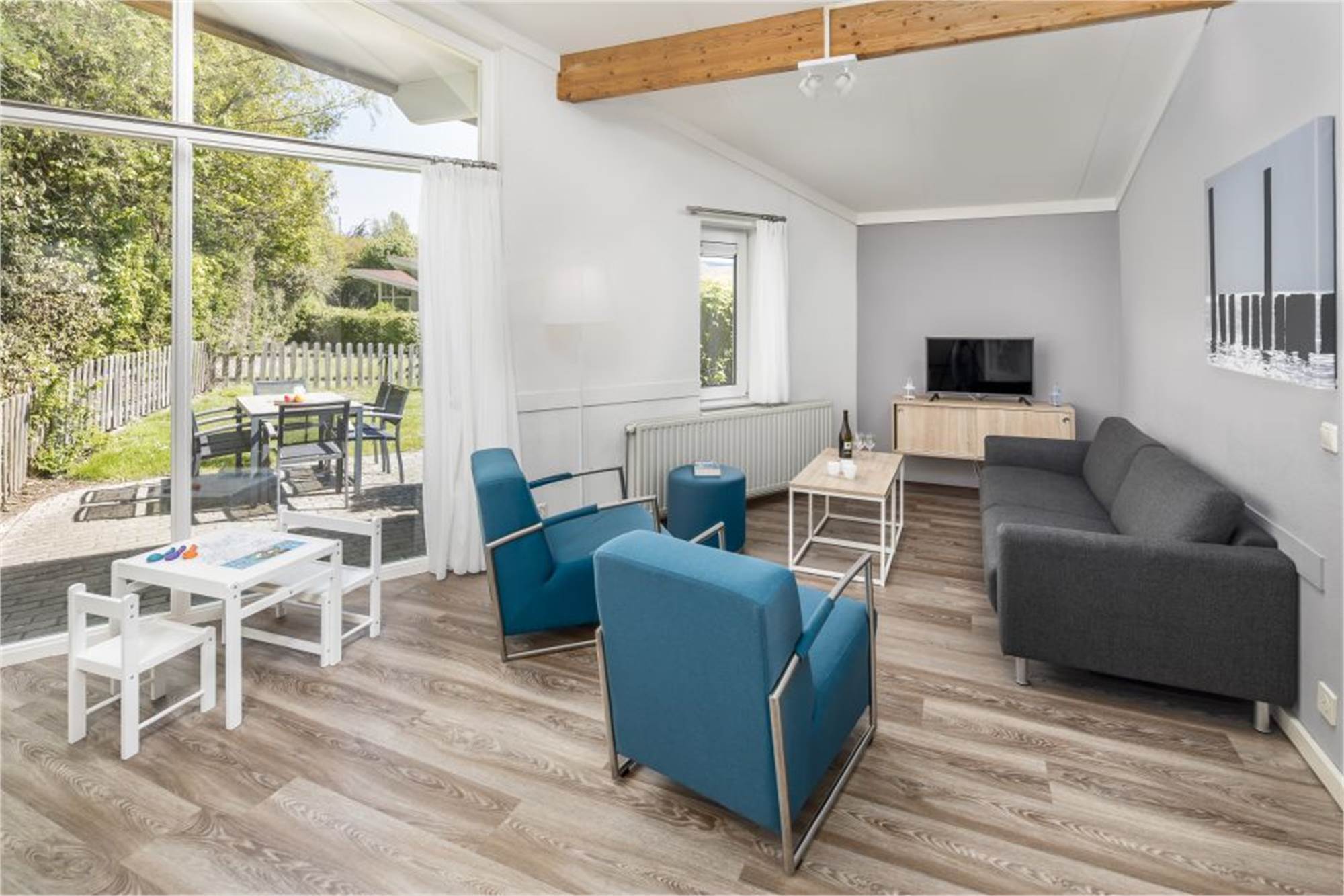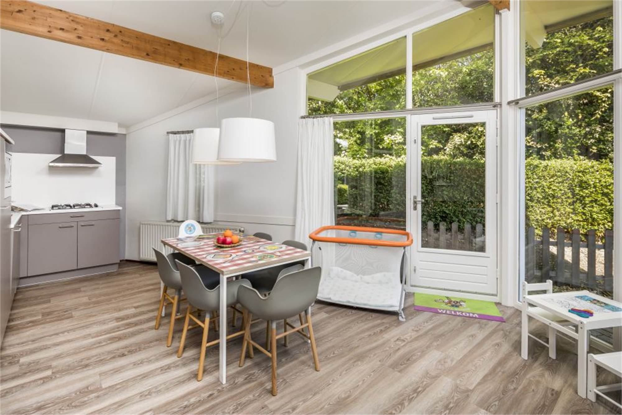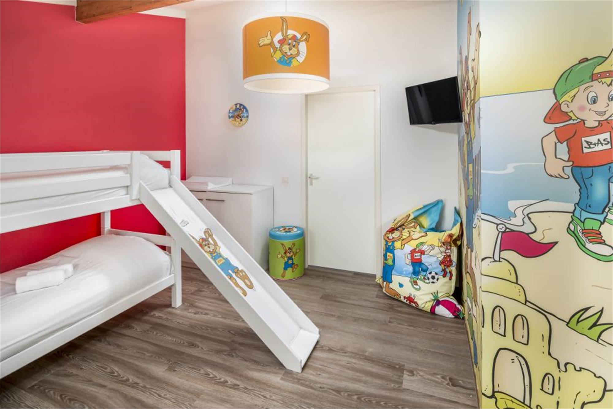 Koos-Bungalow für 4 Personen und ein Baby bzw. Kleinkind. Dieser Bungalow ist komplett im Koos Konijn Stil eingerichtet mit u. a. Koos Duschvorhang, Koos Esstisch, Kindertisch mit Stühlen im Wohnzimmer, Koos Sitzsack, Sitzkissen und Koos Türmatte. Außerdem ist die Unterkunft mit Kinderbett, Babywanne, Kinderstuhl und Laufstall generell besonders kinderfreundlich gestaltet. In der Unterkunft finden Sie ein gemütliches Wohnzimmer mit Sitzecke und Smart-TV. Die offene Küche ist mit Geschirrspüler, Kühlschrank mit integriertem Gefrierfach, Kombi-Mikrowelle und Kaffeemaschine ausgestattet. Die Unterkunft bietet insgesamt 2 Schlafzimmer: 1 Schlafzimmer mit 2 Einzelbetten und einem Kinderbettchen und 1 Schlafzimmer im Koos Konijn Stil mit Etagenbett und Rutsche. Außerdem gibt es ein Badezimmer mit Dusche und Badewanne sowie ein separates Gäste-WC im Flur. Im Außenbereich finden Sie einen schönen Garten, eine möblierte Terrasse und einen Abstellraum. Die Nutzung von WiFi ist gratis.