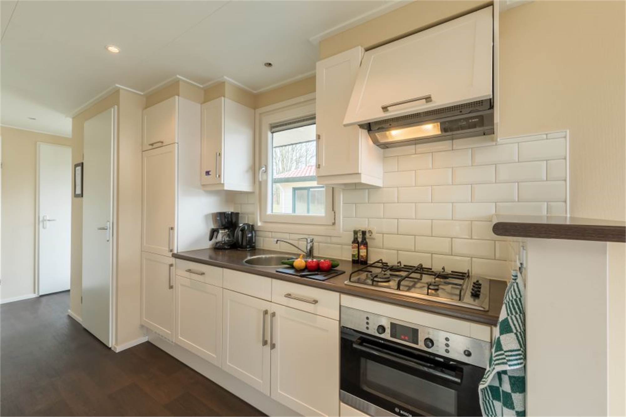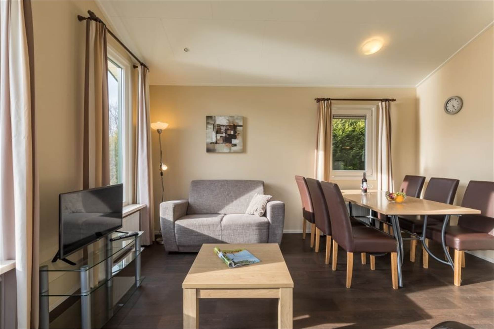 Dieses freistehende, ebenerdige Chalet eignet sich für 6 Personen und verfügt über ein Wohnzimmer und eine offene Küche mit Kombi-Mikrowelle, Kühl-/Gefrierkombination, Geschirrspüler und Kaffeemaschine. Es gibt 3 Schlafzimmer, davon eins mit 2 Einzel-Boxspringbetten und 2 mit Etagenbett. Das Chalet bietet ein Badezimmer mit Dusche und Toilette und eine möblierte Terrasse. Die Nutzung von WiFi ist gratis.