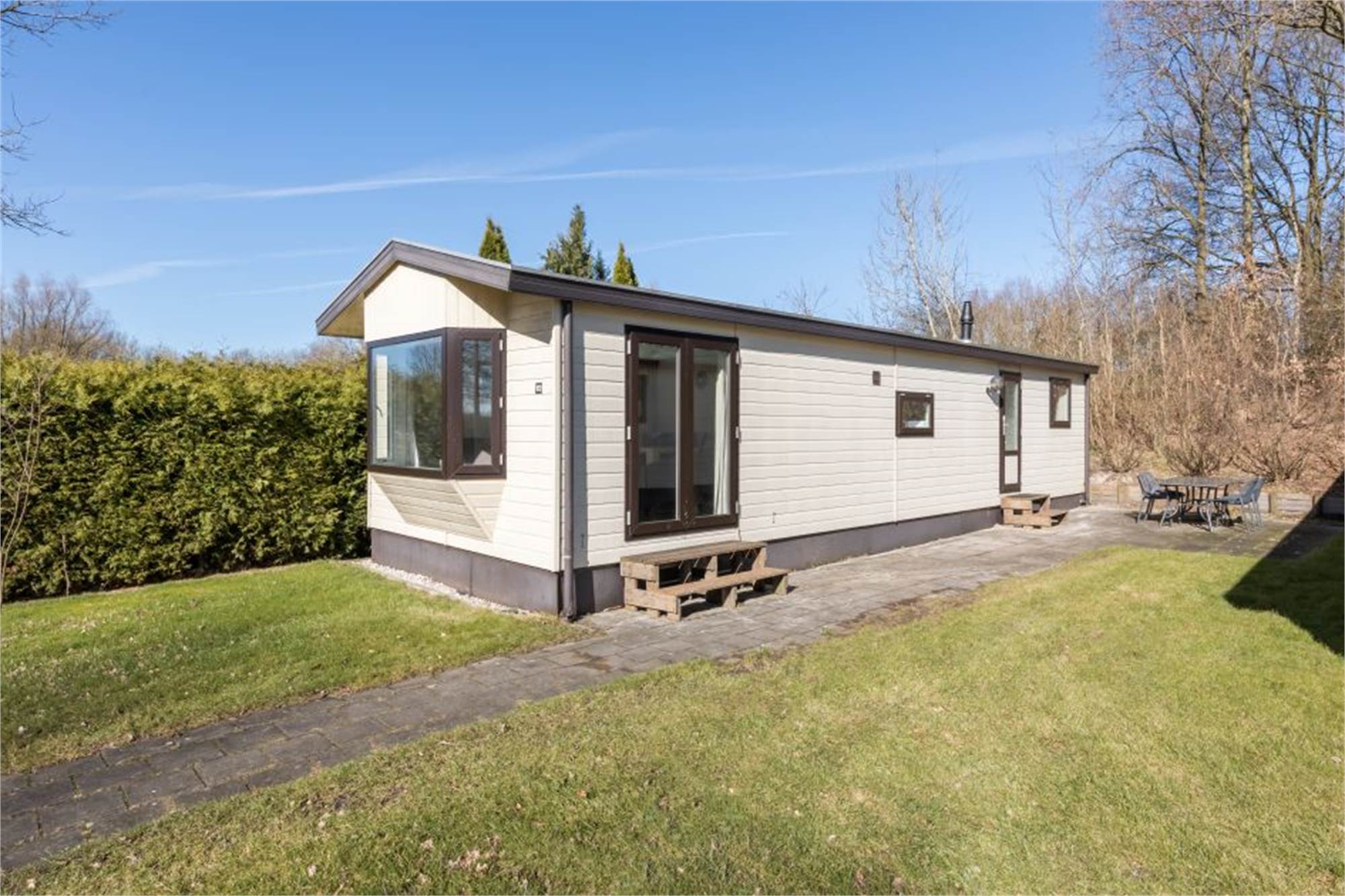 Dieses freistehende, ebenerdige Chalet eignet sich für 6 Personen. Das Chalet verfügt über ein Wohnzimmer und eine offene Küche mit Mikrowelle, Kühlschrank und Kaffeemaschine. Es gibt 3 Schlafzimmer, zwei davon mit 2 Einzelbetten und eins mit Doppelbett sowie ein Badezimmer mit Dusche und Toilette. Im Außenbereich finden Sie eine möblierte Terrasse und die Nutzung von WiFi ist gratis.