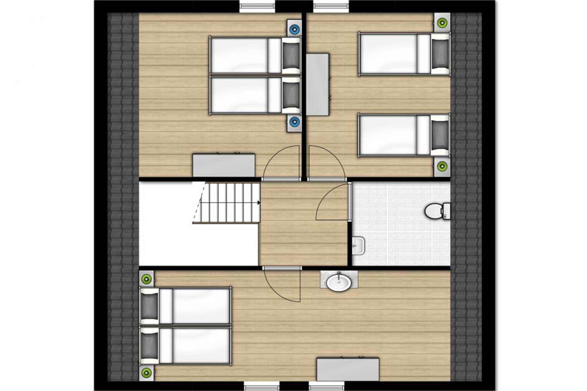Obergeschoss: zwei Schlafzimmer mit je drei Einzelbetten (einige auch mit Doppelbett und einem Einzelbett).