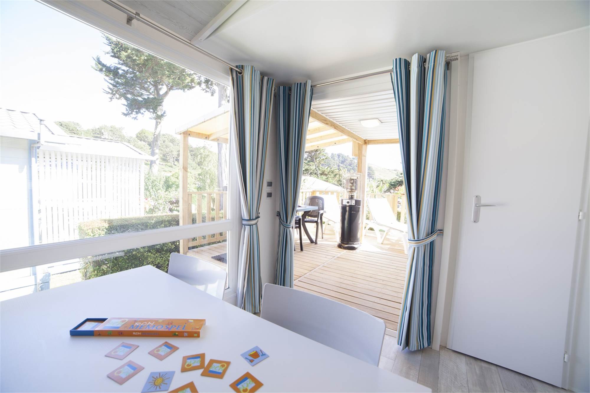 Algemein/lage Freistehend Aussicht auf See/Meer Ausstattungsmerkmale Wohnzimmer mit Terrassentüren Essecke für 4 Personen Elektroofen Extérieur Terrassenmöbel Holzterrasse Veranda Liegebetten Terrassenheizung Audio/Video/Elektronik Fernseher Internet WIFI im Park Flatscreen Fernseher Küche Offene Küche Basis Wasserkocher Abzugshaube 4-flammiger Gasherd Große Kühl-/Gefrierkombination Senseo Kaffeemaschine Mikrowellenherd Schlafen Deckbetten Zimmer mit 2 Einzelbetten Zimmer mit einem Doppelbett Anzahl Schlafzimmer: 2 Sanitäranlagen Dusche Separate Toilette Duschkabine Waschbecken im Badezimmer Thermostathähne Sondermerkmale Haustiere gestattet Rauchfrei
